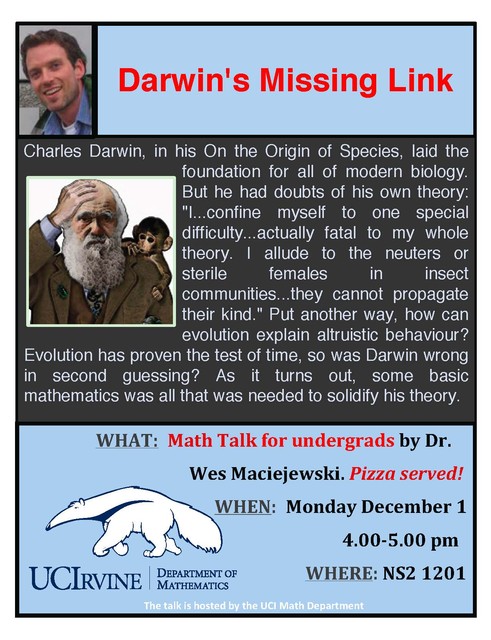 Abstract: Charles Darwin, in his On the Origin of Species, laid the foundation for all of modern biology. But he had doubts of his own theory: "I...confine myself to one special difficulty...actually fatal to my whole theory. I allude to the neuters or sterile females in insect communities...they cannot propagate their kind." Put another way, how can evolution explain altruistic behaviour? Evolution has proven the test of time, so was Darwin wrong in second guessing? As it turns out, some basic mathematics was all that was needed to solidify his theory.