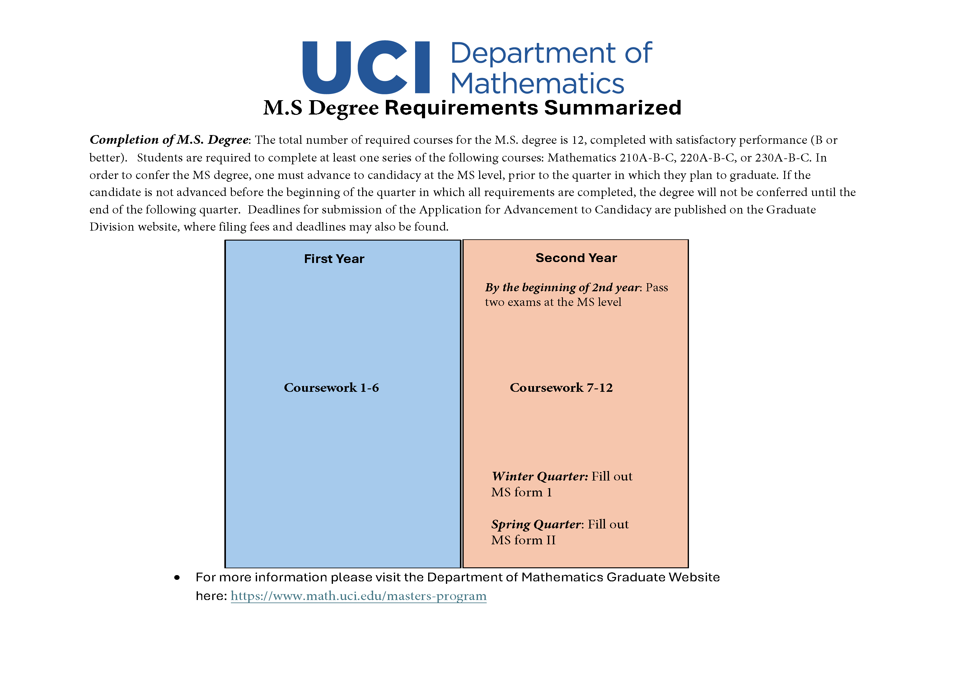 The total number of required courses for the M.S. degree is 12, completed with satisfactory performance (B or better). Students are required to complete at least one series of the following courses: Mathematics 210A-B-C, 220A-B-C, or 230A-B-C. At most, one undergraduate course may count as an elective course, provided it is sponsored by rank faculty and approved by the Graduate Advisor. At most, one elective course (of at least three units) is allowed outside the Department.