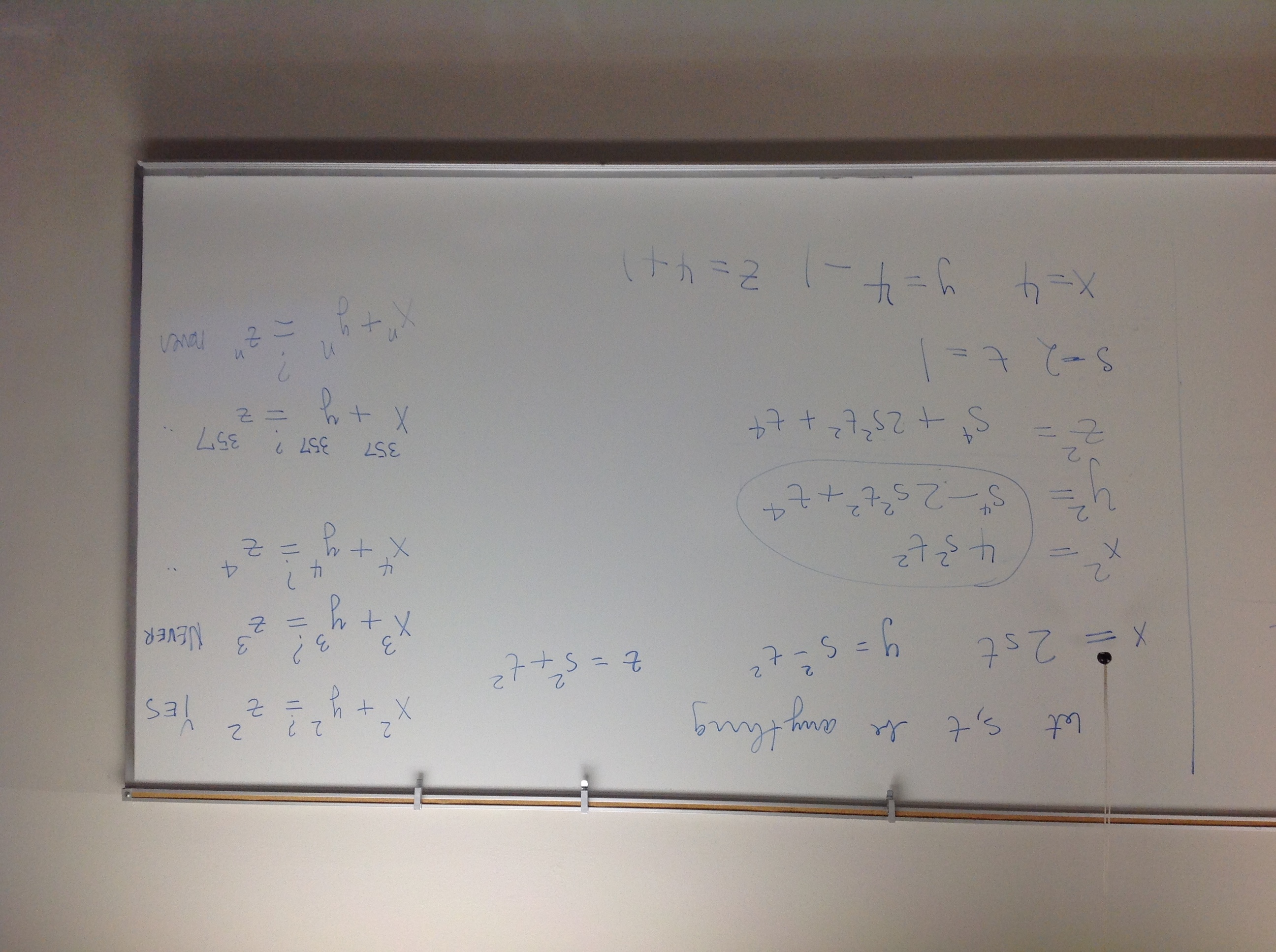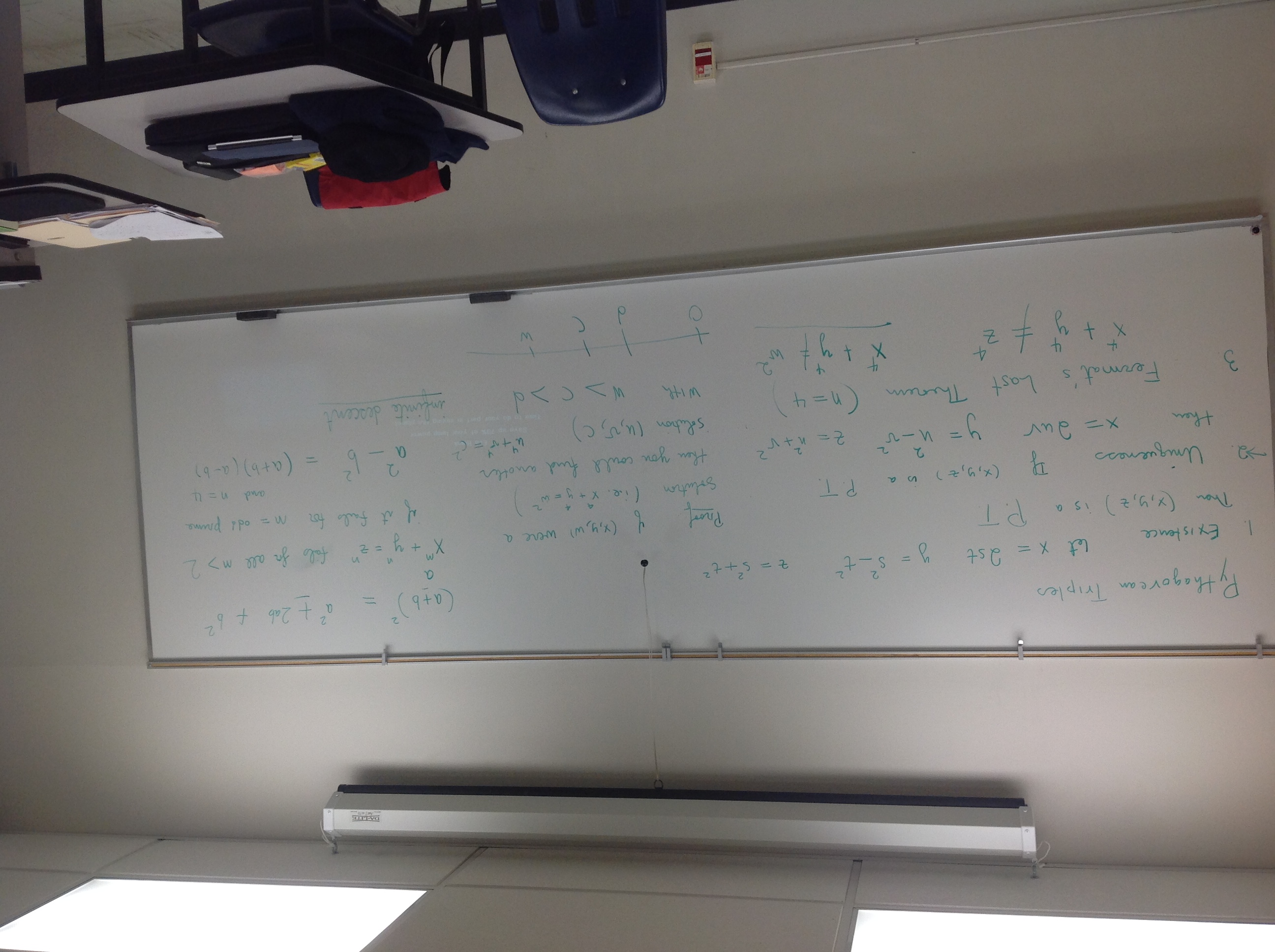 SUMMARY for May 12, 2015. OLD BUSINESS: constructing Pythagorean triples (PT), finding all PT, Fermat's last theorem, n=4, (infinite descent); NEW BUSINESS: 4 color