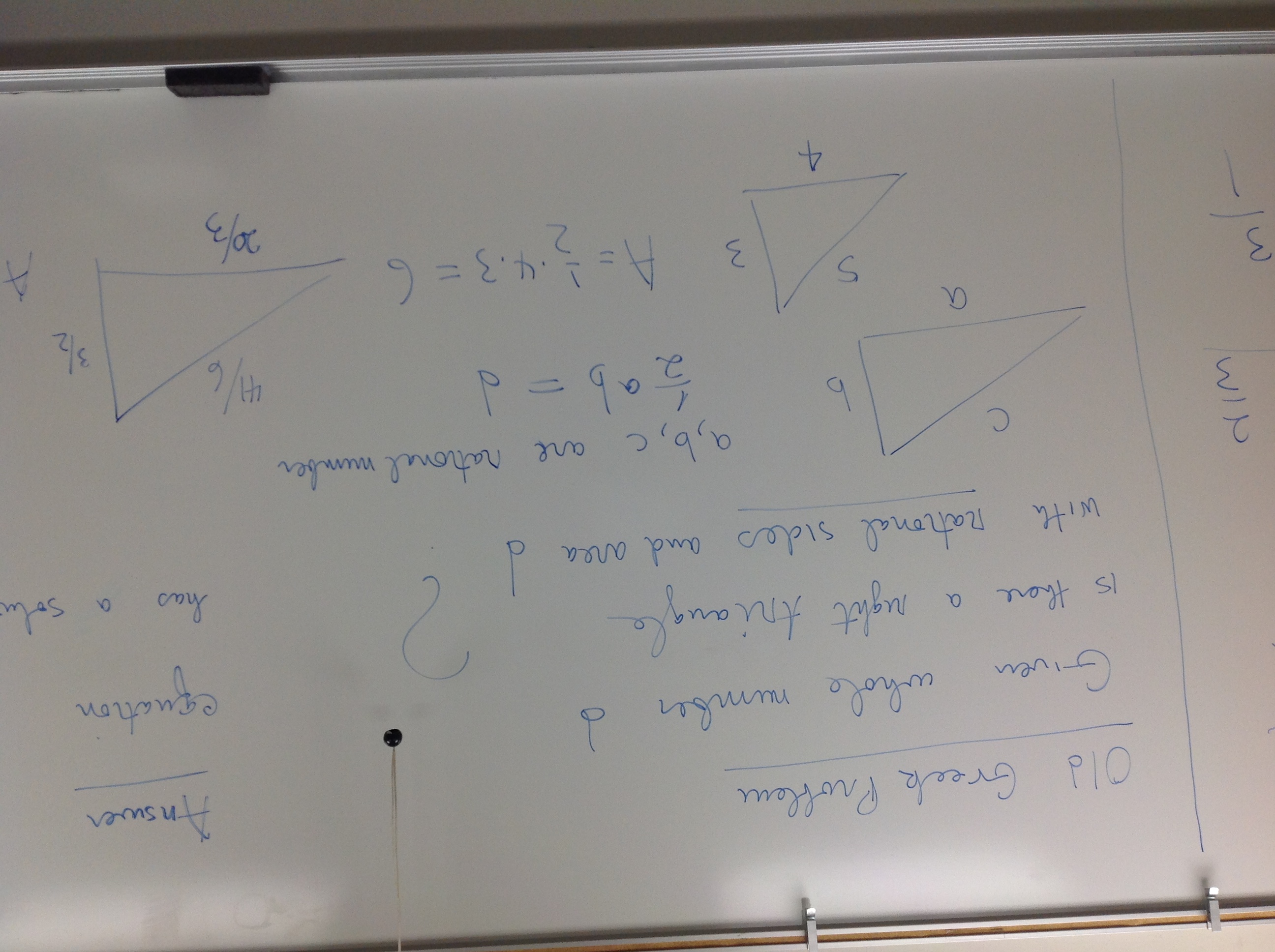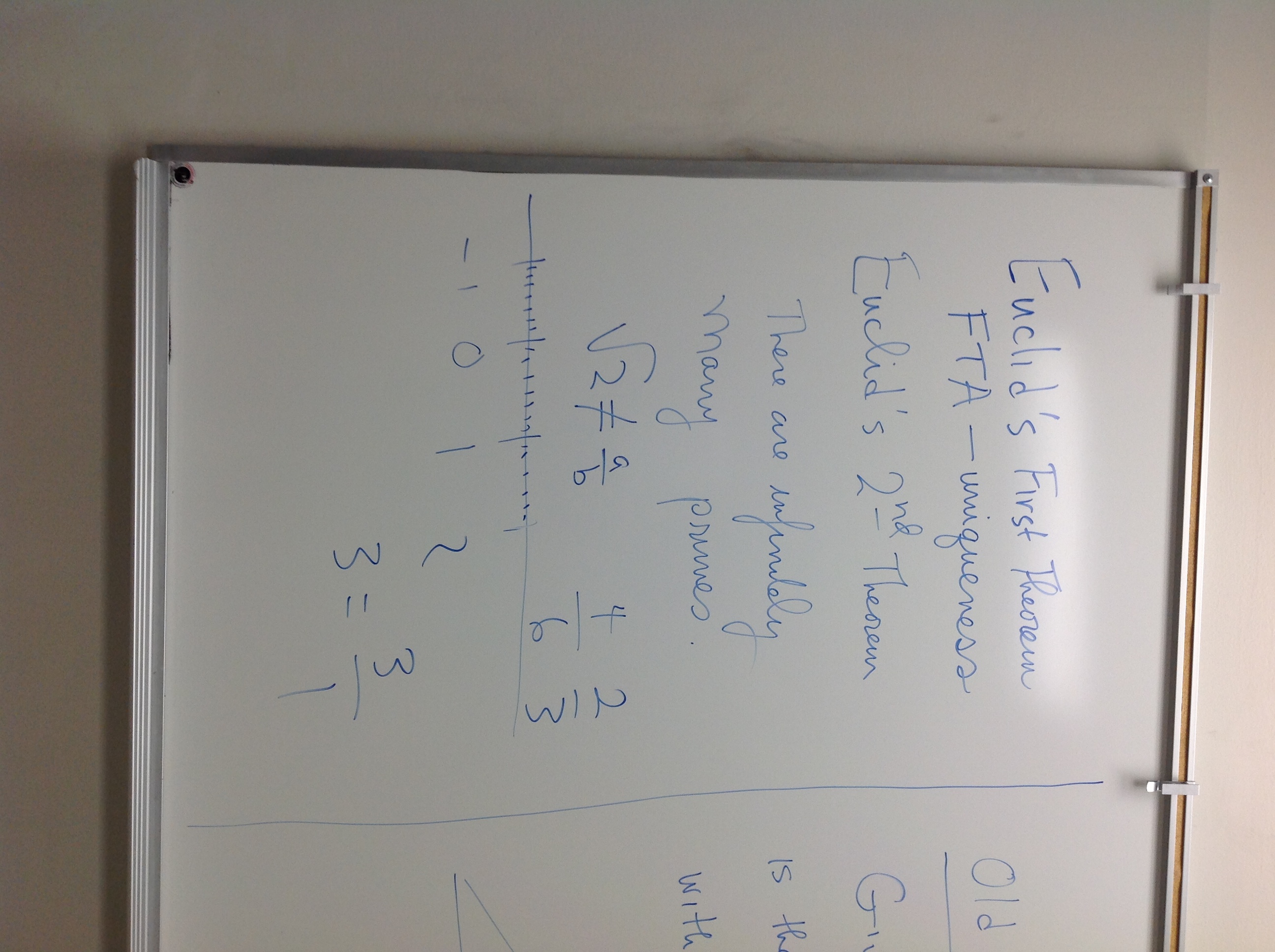 Rational and irrational numbers (Marina High School pp 40-42); Right triangles with integer area and rational sides (Devlin pp 190-194); Primes in an arithmetic progression-variations on Euclid's second theorem-NOT DISCUSSED YET