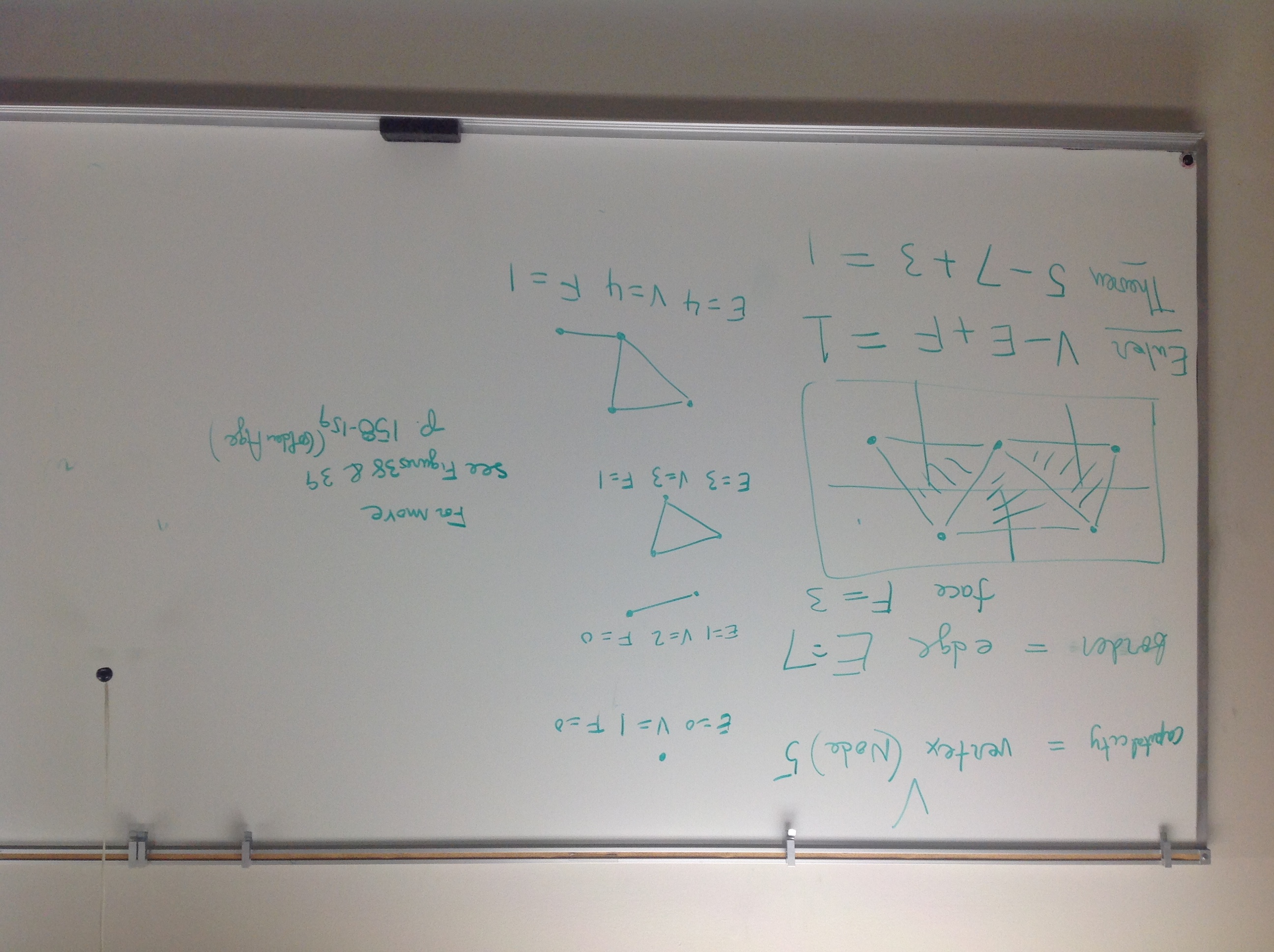 problem-3 colors not enough (Devlin,Golden Age,pp148-152); Networks (Devlin,Golden Age,pp152-157); Euler's formula (Devlin,Golden Age,pp158-160); de Morgan's theorem and the 5 color theorem-NOT DISCUSSED (Devlin,Golden Age,pp161-166)