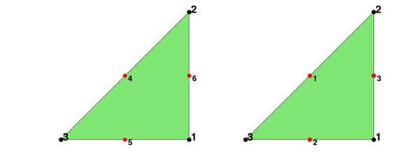 The six dofs in a triangle is displayed in the left. The first three are associated to the vertices of the triangle and the second three to the middle points of three edges. The edges are indexed such that the i-th edge is opposite to the i-th vertex for i=1,2,3.