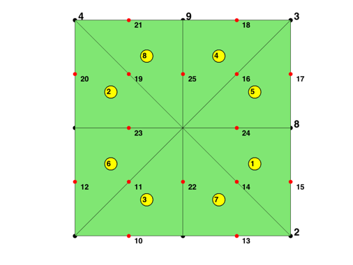 node = [0,0; 1,0; 1,1; 0,1]; elem = [2,3,1; 4,1,3]; [node,elem] = uniformbisect(node,elem); figure; showmesh(node,elem); findnode(node); findelem(node,elem,'all','index','FaceColor',[0.5 0.9 0.45]); [elem2dof,edge,bdDof] = dofP2(elem); findedgedof(node,edge);