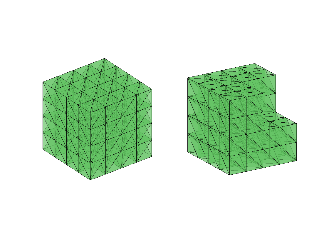 [node,elem] = cubemesh([-1,1,-1,1,-1,1],0.5); figure(1); subplot(1,2,1); showmesh3(node,elem); % A mesh for an L-shaped domain [node,elem] = cubemesh([-1,1,-1,1,-1,1],0.5); [node,elem] = delmesh(node,elem,'x<0 & y<0 & z>0'); figure(1); subplot(1,2,2); showmesh3(node,elem); view(-122,20);