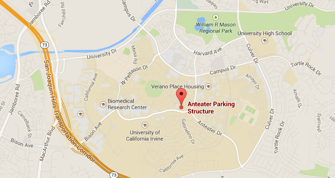 Parking is available in the Anteater Parking Structure (APS), which is located on the corner of East Peltason and Anteater Drive. Entrance into the Anteater Parking Structure is on Anteater Drive. Please visit http://www.parking.uci.edu/maps/ to view a campus map for more information. During 8am and 11am, an attendant at the Anteater Parking Structure kiosk will be distributing parking permits to all the people that have registered on the workshop website, and have requested parking.