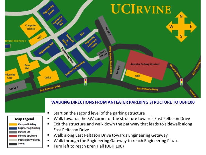The workshop will take place in Donald Bren Hall 1100 (DBH 1100), which is building number 314 on the UCI campus map. To reach DBH1100 from the Anteater Parking Structure: