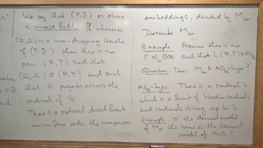 Abstract: In this talk we will outline a proof of Woodin's result that boldface Sigma^1_{n+1} determinacy yields the existence and omega_1-iterability of the premouse M_n^#(x) for all reals x. This involves first generalizing a result of Kechris and Solovay concerning OD determinacy in L[x] for a cone of reals x to the context of mice with finitely many Woodin cardinals. We will focus on using this result to prove the existence and omega_1-iterability of M_n^# from a suitable hypothesis. Note that this argument is different for the even and odd levels of the projective hierarchy.